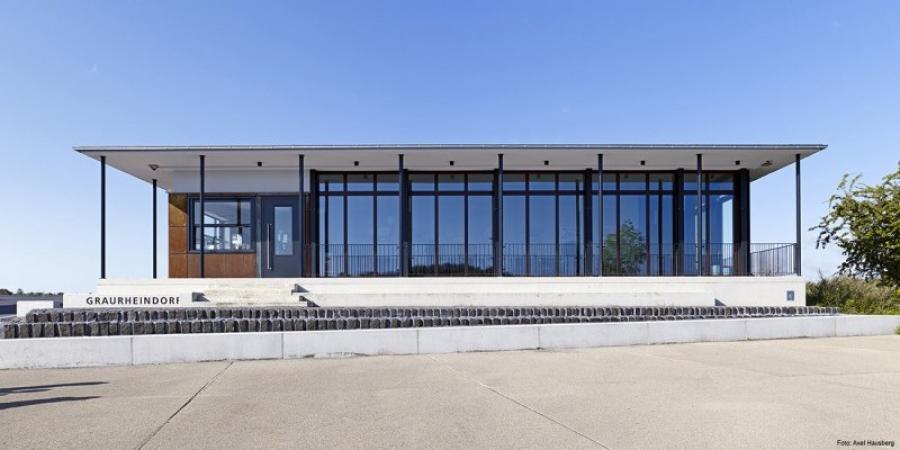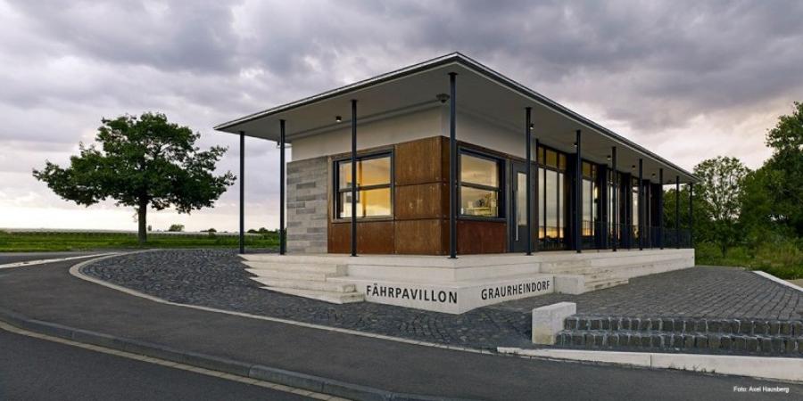 Dort, wo heute das „Grüne C“ zwischen den Ortsteilen Graurheindorf und Mondorf den Rhein quert, fügt sich seit kurzem der Neubau des „Fährpavillons“ in die fächerartig terrassierte Uferlandschaft ein. An historisch prominenter Stelle – kaum jemand weiß noch, dass es hier zu Beginn des 17. Jahrhunderts eine Insel im Rhein mit Befestigungsanlagen der „Pfaffenmütze“ gab – befindet sich heute ein hochwertiger Anlaufpunkt für die Bewohner der umliegenden Stadtteile, „Rheinwanderer“ und Touristen im Bonner Norden. Die konstruktive Auseinandersetzung mit Hochwasserschutz, Landschaftsschutz und „Bauen im Außenbereich“ hat in einer 8- jährigen Planungs- und Bauzeit alle Beteiligten gefordert. Nur mit viel Unterstützung von allen Seiten konnte das Vorhaben zu Erfolg und Realisierung geführt werden. Im festgelegten Baufenster ist das neue Gebäude für Saisongastronomie leicht nach Süden gedreht. Seine Proportionen sind dem umgebenden, weitläufigen Landschaftsraum angepasst. Zur Rheinseite öffnet sich der Gastraum mit einer großzügigen Fensterfront zum Panoramablick über den Fluss. Die vorgelagerte Galerie ist mit einem filigranen Stahlgeländer ausgestaltet. Demgegenüber ist die Straßenansicht geschlossen gehalten. Hier bildet das Mauerwerk aus Betonfertigteilstürzen einen ruhigen Wandcharakter mit einer leicht changierenden Oberfläche. Der Ausschank öffnet sich über Eck mit zwei großen Schiebefenstern, die von Cortenstahlplatten gerahmt sind. Die rostrote Farbigkeit der Stahlplatten markiert den Gebäudezugang. Ein hundertjähriges Hochwasser hat die Bonner Rheinanlieger in den letzten 20 Jahren bereits zweimal getroffen: entsprechend sorgfältig musste der Hochwasserschutz geplant und umgesetzt werden. Sichtbar und gleichzeitig unsichtbar sind die Anforderungen in die architektonische Gestaltung eingeflossen: Markante Stahlrahmen umfassen Türen und Fenster, T- Stahlstützen tragen rheinseitig das Dach. Bei Hochwasser verschließen dicht aufgeschraubte Platten die Öffnungen, Dammbalken werden zwischen die ⌶-Stahlstützen eingeschoben, fixiert und füllen sich sukzessive mit Wasser. Die damit entstehende Auflast presst die Profile fest aneinander und schützt die raumhohe Holzverglasung des Gastraumes. Grundkonzept der Tragwerksplanung ist eine Stahlbetonkonstruktion auf einer 80 cm dicken wasserdichten und fugenlosen Bodenplatte, um Lasten gegen Auftrieb aus dem Hochwasserfall zu generieren. Die Umfassungswände wurden in WU-Beton ausgeführt. Entsprechend den Anforderungen an Gebäude in Überschwemmungsgebieten wurden die technischen Anlagen im Obergeschoss untergebracht, das über der HQ200- Linie liegt und über einen Zugang von außen (Dachluke) verfügt. Das eingebrachte Bauvolumen wird durch den Rückbau der nahegelegenen Schotterrampe ausgeglichen.