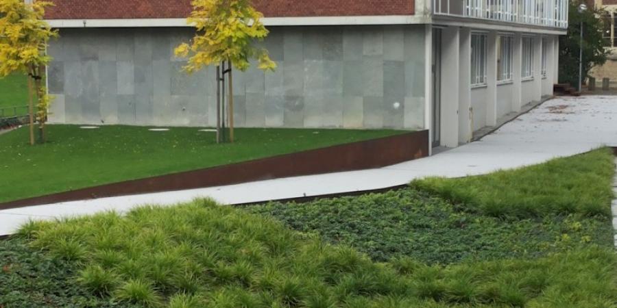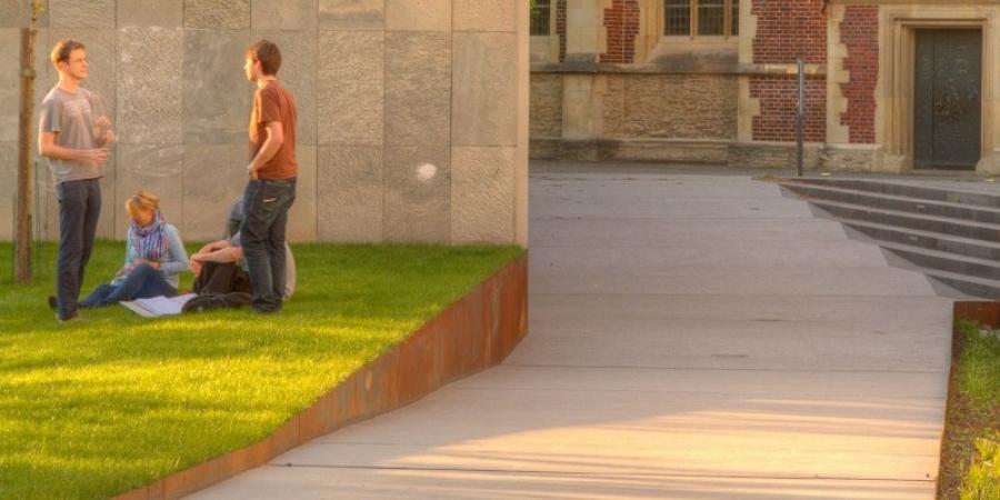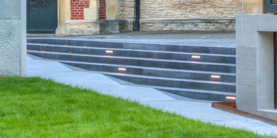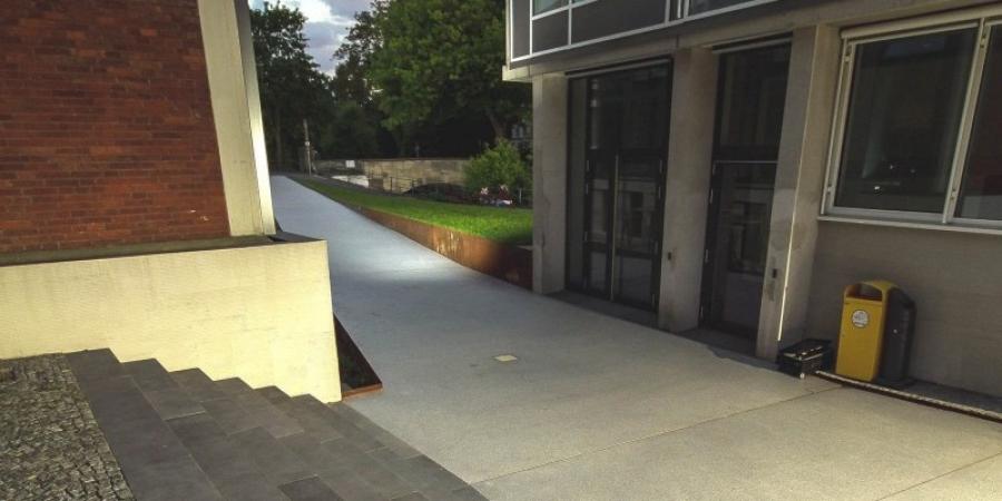Freiräume für Bildungseinrichtungen sind spannend – besonders, wenn sie, wie bei unserem Projekt Exzellenzcluster Religion an der Johannisstraße in Münster, mitten im Stadtzentrum liegen. Entstanden ist eine Freitreppe aus Betonfertigteilen, die in besonderer Weise mit der notwendigen barrierefreien Rampe spielt.