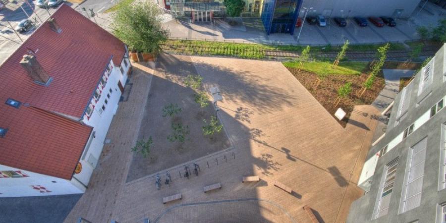 Durch die Form des Gebäudes entsteht zwischen dem Multiplex-Kino und einer Traditionsgaststätte ein hochwertiger Stadtplatz. Am Albersloher Weg ist der Haupteingang repräsentativ gestaltet, die Freiraumgestaltung führt die Passanten und Besucher durch expressive Formen auf den künstlerisch beleuchteten Platz. Geschnittene Platanen bilden einen grünen Schirm und laden zum Verweilen ein. Auch der Bereich der Schienenanlage musste überplant werden.