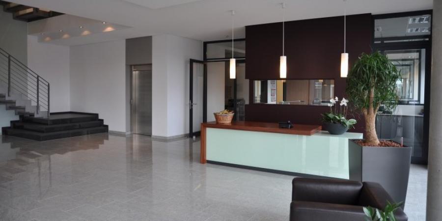 Das Betriebsgebäude gliedert sich in Werkstatthalle mit Lager und Sozialtrakt und einem Bürogebäude für insgesamt 55 Mitarbeiter. Als zeitlos klassische Architektur stellt sich das 3-geschossige Bürogebäude mit einer ruhigen Fassade dar, die durch gestalterische Vor- und Rücksprünge sowie durch Material- und Farbkontraste betont wird. Die einladende Eingangshalle findet ihre äußere Gestaltung durch die Glasfassade und durch die vertikale, über das Gebäude hinausragende, anthrazitfarbene Wandscheibe, die den Eingang schon von Weitem betont und als Durchdringung im Gebäude in allen Geschossen abzulesen ist. Die Eingangshalle ist lichtdurchflutet mit gestalteter Treppe, Aufzug und Galeriebereichen. In den Obergeschossen befinden sich offene Kommunikationsbereiche mit Stehtischen und Teeküche sowie Büros mit Glastrennwänden sowie Besprechungs- und Sozialräume mit auf ganzer Länge vorgelagerter Dachterrasse und Blick auf das über der Werkstatthalle gelegene Gründach.