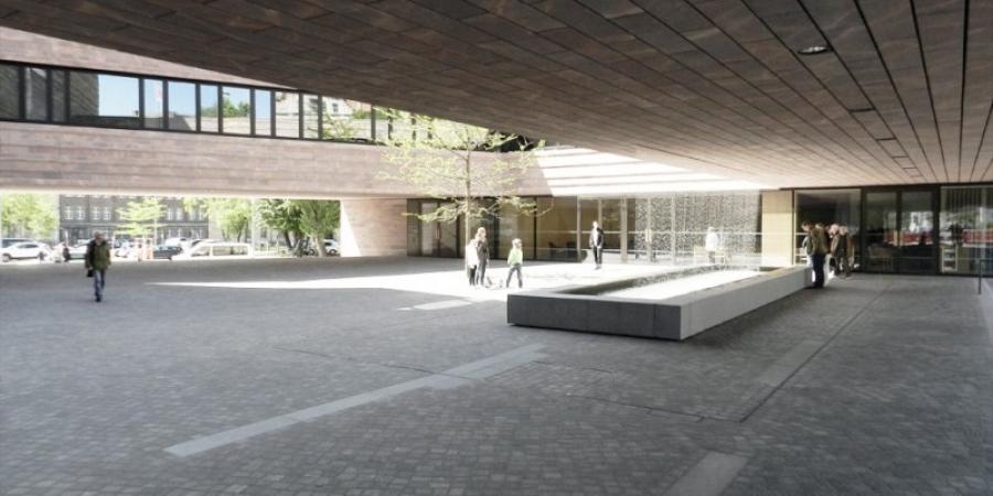 Um der Besonderheit des Gebäudes und seiner Lage gerecht zu werden wird das unmittelbare Umfeld der Kirche als Platz verstanden, welcher sich einer Passage gleichend durch den Kirchhof zieht. Hierbei steht die Verwendung einer einheitlichen Materialwahl als eindeutiger Kontrast zur Fassade im Vordergrund. Der besondere Charakter des Kirchhofes wird maßgeblich durch einen gezielt gesetzten Solitär und einen Wasservorhang gestärkt. Neben der atmosphärischen Überhöhung dient der Wasservorhang der Minderung der angrenzenden Straßenimission und Klimaverbesserung. Die angrenzende Nonnenmühlgasse wurde in Form eines niveaugleichen und gegliederten „Straßenquerschnitts“ ausgebildet. Die einheitliche Materialwahl in unterschiedlichen „Körnungen“ vermeidet einen gestalterischen Bruch bezüglich der gewünschten „Platzsituation“.