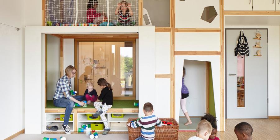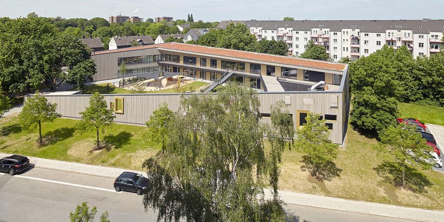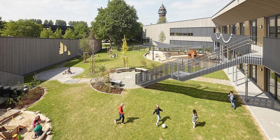 Große Fenster, Kletterschränke und jede Menge Platz: Die erste Kita am Hauptsitz von ALDI SÜD in Mülheim an der Ruhr ist ein toller Ort zum Spielen, Lernen und Toben. Zentral auf dem Grundstück platziert, bietet der zweigeschossige Neubau Platz für etwa 110 Kinder in sechs Gruppen sowie ein integriertes Familienzentrum. Im Sommer 2017, nach 14-monatiger Bauzeit, waren die ersten Räume bezugsfertig. Der winkelförmige Baukörper umfasst das Grundstück und orientiert sich in seiner Form an den umgebenden städtebaulichen Kanten. Auf diese Weise fügt sich das Gebäude in die Umgebung ein. Im Längsriegel finden sich über zwei Geschosse die Gruppenbereiche mit Nebenräumen; Verwaltung, Küchen und Mehrzweckräume sind im Längsriegel untergebracht. Ergänzt wird der Neubau durch ein zum Teil zweigeschossiges, L-förmiges Außenraumbauwerk in Form eines Laubengangs. So entsteht eine zweite Spielebene, wobei Erdgeschoss und Obergeschoss mit Hilfe von Kletternetzen und einer Rampe spielerisch verbunden werden.