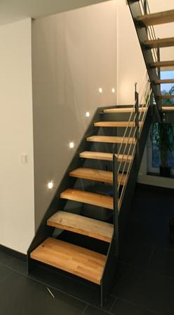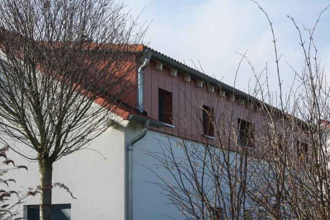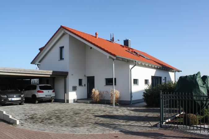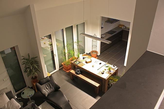 Das Wohnhaus ist in Längsrichtung in zwei Haushälften geteilt: in einen zweigeschossigen nördlichen Abschnitt mit den kleinteiligen Neben- und Schlafräumen und in einen beidseitig zurückversetzten südlichen Abschnitt mit Küche, Eß- und Wohnzimmer. Beide Haushälften sind unter einem auskragendem Dach vereint, das sowohl den Eingang wie auch gartenseitig die Terrasse überdeckt. Die südliche Haushälfte ist weitgehend als offene Raumfolge, bis unters Dach reichend, ausgebildet mit weitläufigem Blick in die freie Landschaft. Fensteröffnungen in der inneren Längswand erlauben von beiden Ebenen aus Einblicke in den zentralen Wohnraum. Die technische Ausrüstung umfaßt eine zentrale Lüftungsanlage mit Wärmerückgewinnung und Erdwärmepumpe mit Tiefenbohrungen zur Kühlung und Wärmeversorgung.