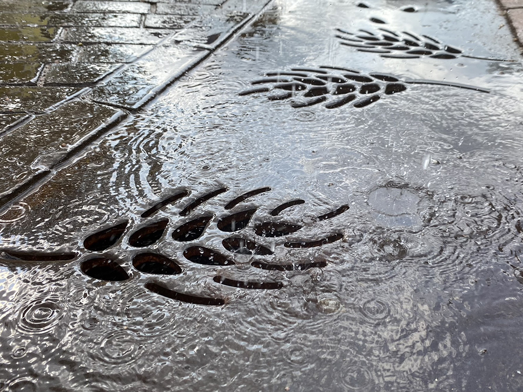 Mithilfe einer Entwässerungsrinne wird anfallendes Regenwasser gesammelt und in einer Zisterne gespeichert.