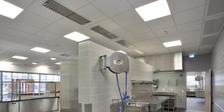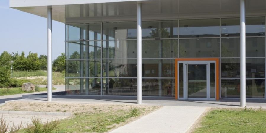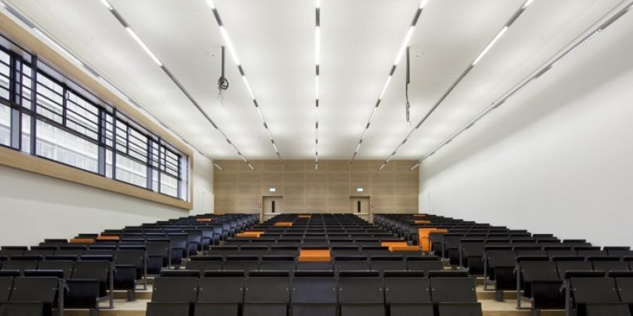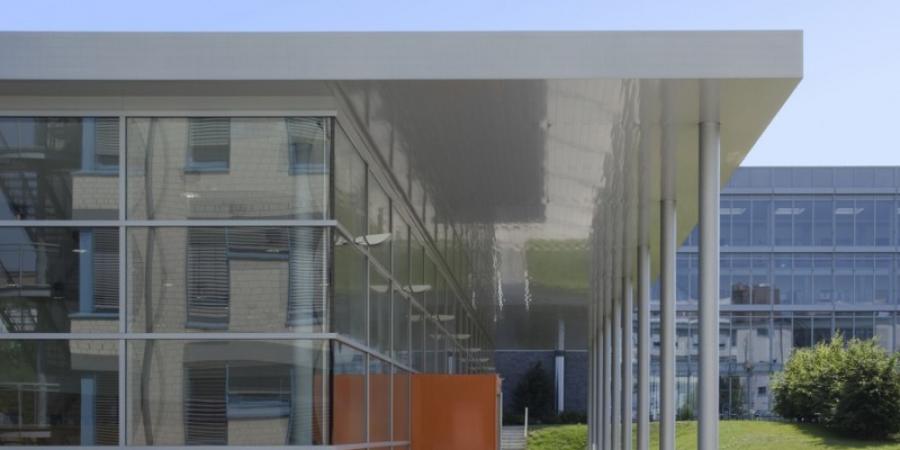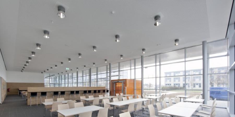 Für die Fachbereiche Architektur, Wirtschaft und Informatik entsteht auf dem Gelände der Universität Dortmund ein Infrastrukturgebäude. Der Neubau umfasst einen Hörsaal mit 250 Plätzen und eine Cafeteria/Mensa mit 200 Plätzen. Das eingeschossige Gebäude ist geschickt in den Freiraum zwischen den Bestandsgebäuden platziert und lässt dort einen Campus entstehen. Speisesaal und Hörsaalfoyer orientieren sich mit ihrer Glasfassade nach Süden zum Campus. Im Norden sind die Küchenbereiche und die Anlieferung angeordnet. Hier ist der Neubau geschlossen und mit großformatigen Eternittafeln bekleidet. Das Fassadenraster wird in die Glasfassade fortgeführt. Ein flaches, begrüntes Dach fasst die Bereiche zu einer Einheit zusammen. Der umlaufende Dachüberstand wird im Süden auf Stützen gestellt und bietet als großzügige Eingangsloggia hohe Aufenthaltsqualität. Das Materialkonzept ist geprägt vom Anthrazit der Fassade und der Bodenbeläge, den weißen Wänden und den Eichenholz farbenen Oberflächen der Wandbekleidungen, der Möbel und der Türen.