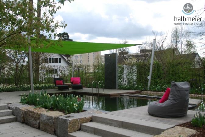 Viele kreative Ideen machen das gemeinsame Projekt der Unternehmen Halbmeier Gartengestaltung, Terra Flora und Uhlig, das im Rahmen der Landesgartenschau 2017 präsentiert wurde, zu einem echten Wohlfühlgarten. Umgeben von einer Hainbuchenhecke und Sichtschutzelementen aus Cortenstahl ist ein Rückzugsort voller Atmosphäre entstanden. Die Anlage lädt dazu ein, inmitten des Trubels der Gartenschau entspannte Momente zu verbringen und neue Energie zu tanken. Sicherlich finden Besucher auch die ein oder andere Inspiration für den eigenen Garten – sprechen Sie uns gerne darauf an! Zentrales Element des Themengartens ist sein höher gelegener Schwimmteich mit ausgereifter Technik zur Wasseraufbereitung, die vollkommen auf chemische Zusätze verzichtet. Schiefer-Trittsteine und eine Krustenplatte trennen Schwimm- und Pflanzenzone optisch ansprechend voneinander ab. Das angrenzende Holzdeck wird von einem großen, elektrisch betriebenen Sonnensegel beschattet.