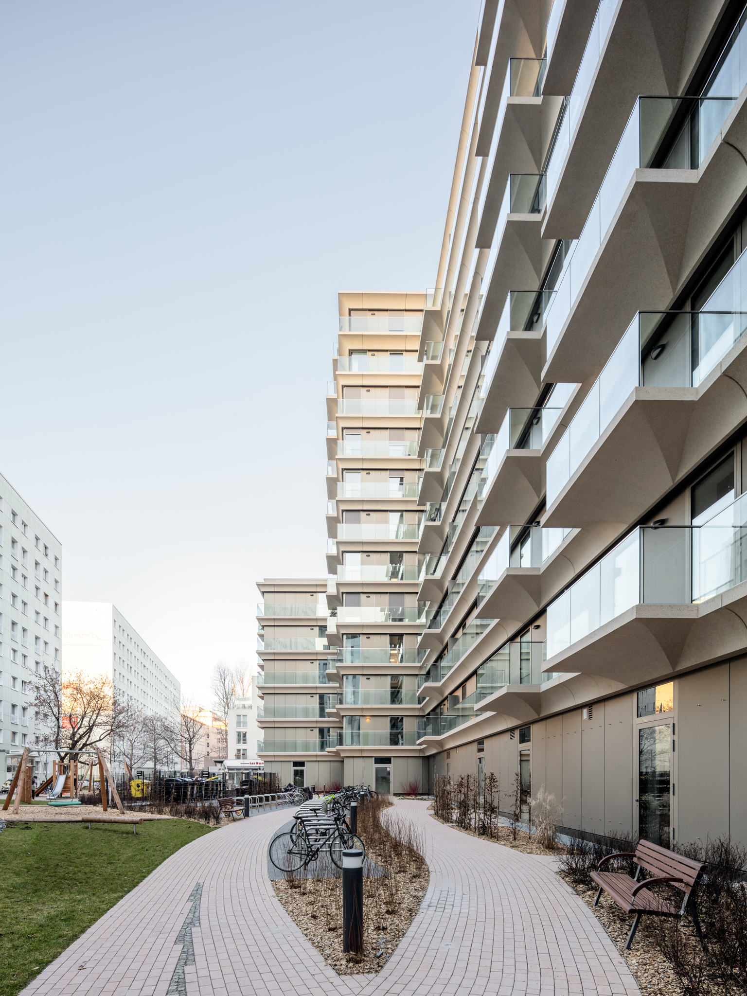 Das Architekturbüro Tchoban Voss Architekten entwarf das Königstadt-Quartier in Berlin mit 117 Wohneinheiten. Für die großen, umlaufenden Balkone, die den Wohnungen Leichtigkeit, Licht und Eleganz verleihen, lieferte Abel Metallsysteme insgesamt 2424m Glasgeländer VISIOPLAN. Eine bautechnisch ideale und designstarke Lösung. Bearbeitet wurde diese vor Ort von Montageart.