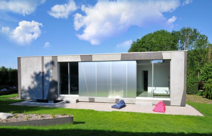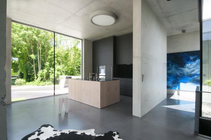 Ein Haus in Sichtbeton-überzogen mit einem Muster aus sandgestrahlten Flächen - angezogen wie mit einem Kleid und zeigt sich doch in seiner ganzen Nacktheit. Das Grundstück mit leichter Hanglage liegt am Ostufer des Starnberger See's, 5 Minuten vom See entfernt. Das Haus hat 300 qm Wohnfläche, 430 qm Nutzfläche. Der Flachbau wurde fast durchgehend in Sichtbeton konstruiert. So sind fast alle Wände im Gebäudeinneren Sichtbetonwände und alle Decken Sichtbetondecken aus Ortbeton. Die Betonfassade wurde aus Fertigteilen mit 18cm Kerndämmung hergestellt. Die Betonflächen in der Fassade wurden mit Aluminiumverbundtafeln kombiniert. Im Gebäudeinneren wurden dem Sichtbeton die Materialien weiß gebeizte Eiche und schwarzes Linoleum zugeordnet. Der konsequente Einsatz von Beton setzt sich fort mit der Verwendung von anthrazit eingefärbtem Sichtestrich. Nur in Schlaf- und Naßräumen sind die Böden mit grauem Feinsteinzeug belegt. Die Erschließung des Hauses erfolgt - begünstigt durch die Hanglage - über eine Rampe mit begleitender Stufenanlage über das Sockelgeschoss. Rampe, Stufenanlage und überdachter Vorplatz sind dem Sockelgeschoß vorgelagert und in das Gelände geschnitten. Durch diesen Negativraum erfährt das Sockelgeschoß eine entsprechende Bedeutung. Durch das zurückgezogene, mit schwarz eloxiertem Aluminium verkleidete Sockelgeschoss schwebt das Obergeschoss – der Hautwohnbereich – über dem Gelände Inmitten des Obergeschosses befindet sich ein Lichthof, um den sich alle Räumer herumgruppieren. Der Lichthof ist das Zentrum und Herz des Hauses.