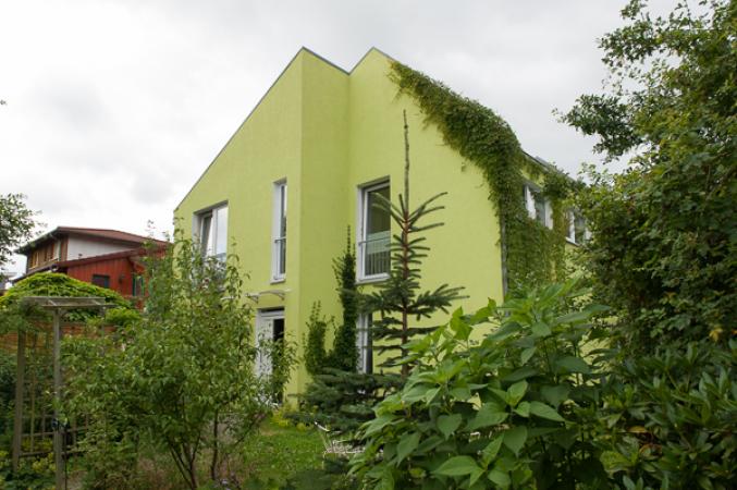 Vorgabe für dieses Einfamilienhaus in Lilienthal waren die Gestaltung eines kompakten und somit kostengünstigen und Energie sparenden Baukörpers. Das Grundstück erlaubte eine optimale Ausrichtung des Gebäudes mit den Wohnräumen nach Südwesten und Südosten. Zu diesen Seiten öffnet sich das Haus mit großzügigen dreifach-verglasten Fenster dem Garten. Die offene Grundrisskonzeption im Erdgeschoss mit dem Wohn- und Küchenbereich wird durch einen großzügigen Luftraum mit Galerie unterstrichen. Das Gebäude ist mit einer Erdwärmepumpe ausgestattet. Die Installation von außen liegenden Holzschiebeläden vor den großen Fenstern ist zukünftig vorgesehen.