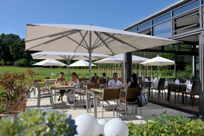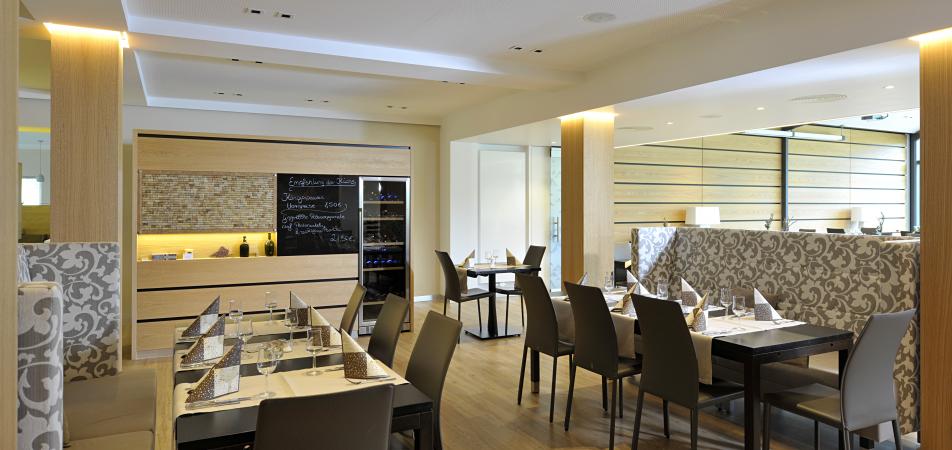 Der Restaurantanbau in Form eines großflächig verglasten Wintergartens macht mit der vorgelagerten Terrasse die umgebende malerische Landschaft unmittelbar erlebbar. Die Neugestaltung des Restaurants lässt die Wahl zwischen intimen und geselligen Zonen. Eine mobile, mit einem Birkenwald bedruckte Glastrennwand, erlaubt zusätzlich eine räumliche Separation für private Feiern oder Konferenzen. Der neue Sauna- und Fitnessbereich bietet dem Hotelgast in einem hochmodernen und anregenden Ambiente die Möglichkeit zur Entspannung und zu sportlicher Aktivität.